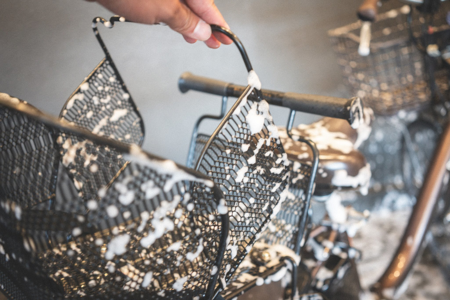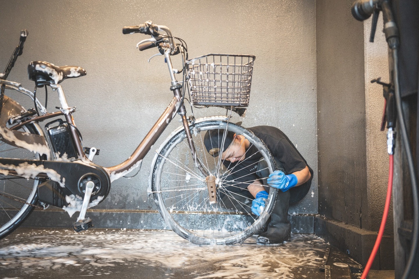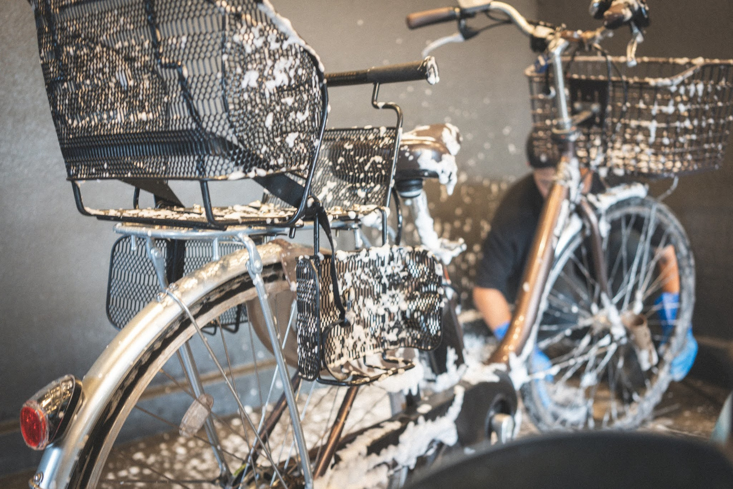 ただ、長年の活躍でチェーンは茶色く錆び、全体もくたびれ気味。自転車の洗車は以前から気になっていたそうで、数年前にテレビで当店ラバッジョを見かけて名前は覚えてくださっていたものの、「場所が分からなくてそのまま…」という状態だったとか。ところが最近になって調べたら、なんと家から近い!ということで今回の洗車に繋がりました。