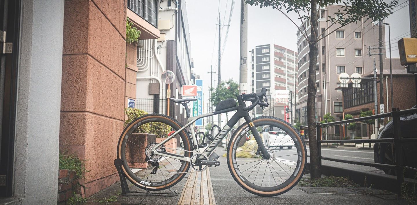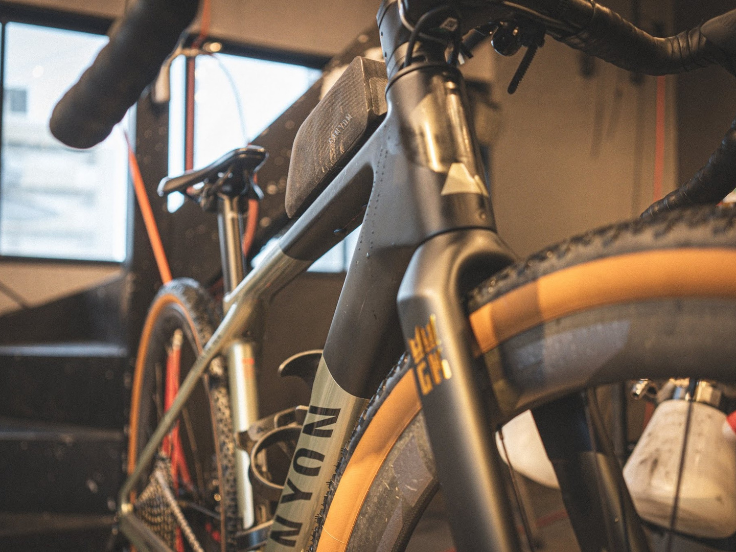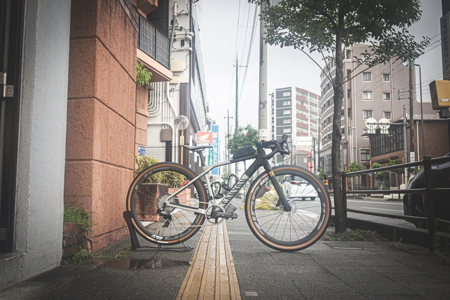 オーナーはキャニオン・グレイルに乗るお客様で、高知県で開催された「スクモグラベルまんぷくライド」に参加された帰り道でした。当日の天候は、雨が降ったり止んだり。路面には砂利や土に加え、大きな水たまりが点在。走れば走るほど、タイヤもフレームもドロドロに──。