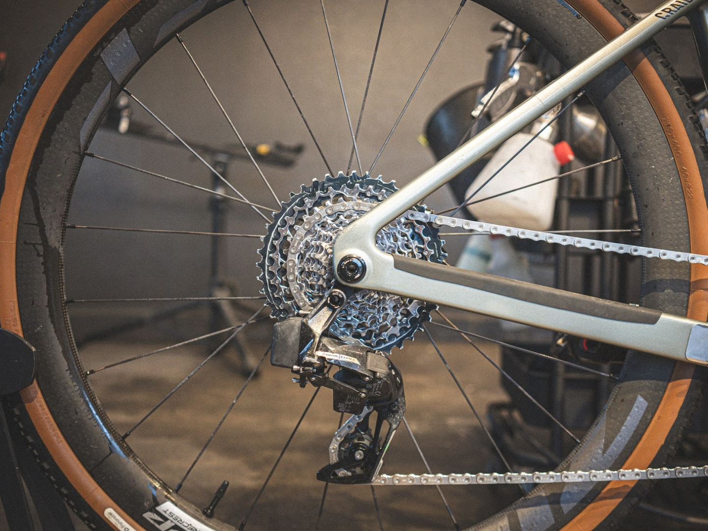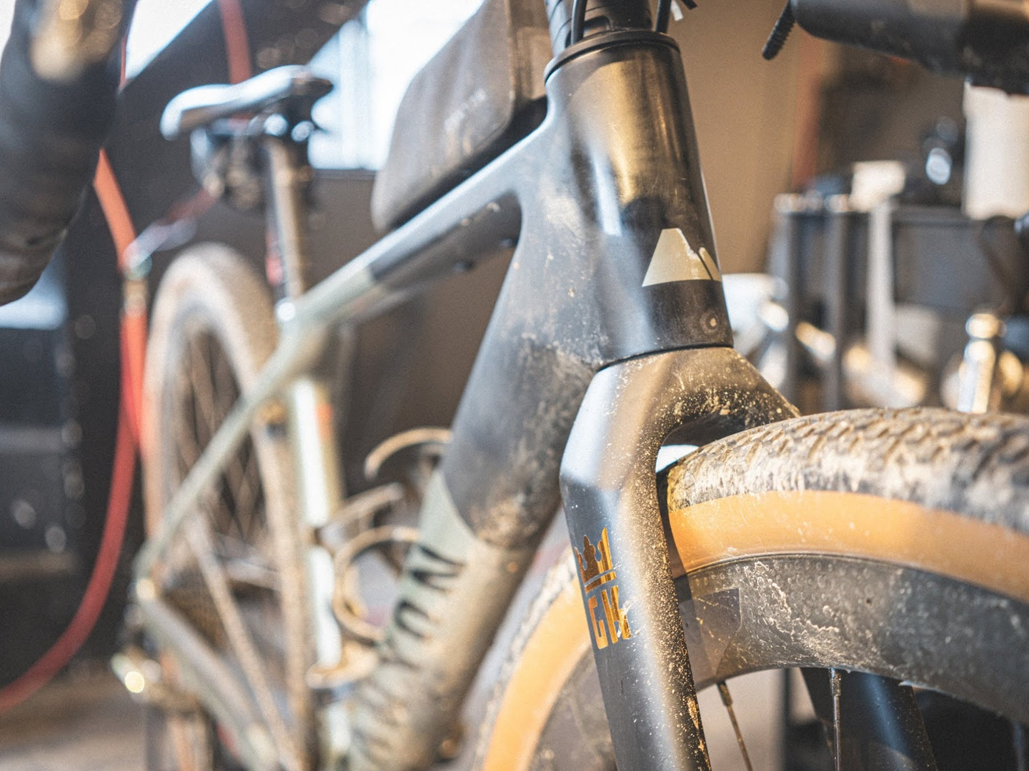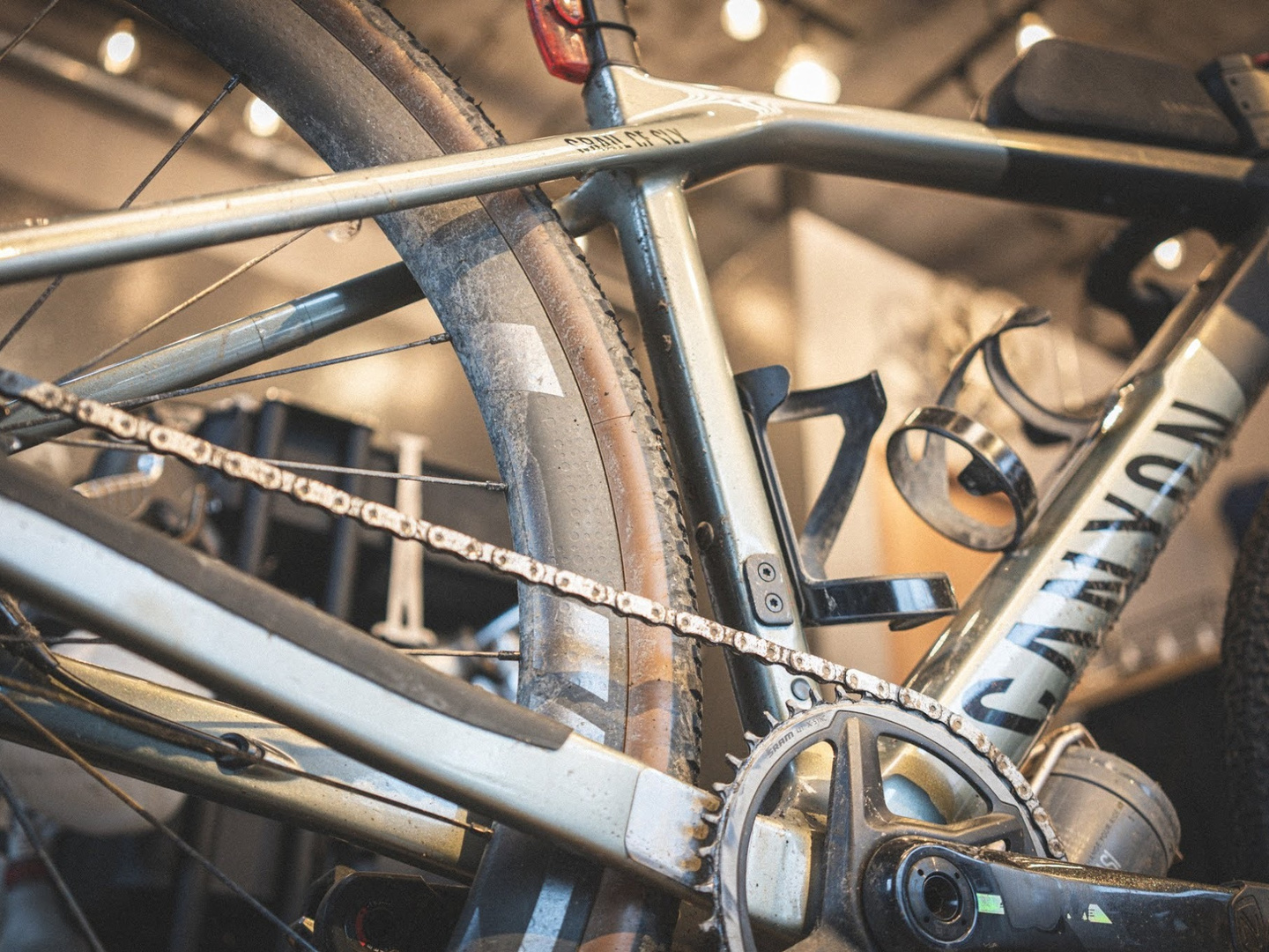 オーナーはキャニオン・グレイルに乗るお客様で、高知県で開催された「スクモグラベルまんぷくライド」に参加された帰り道でした。当日の天候は、雨が降ったり止んだり。路面には砂利や土に加え、大きな水たまりが点在。走れば走るほど、タイヤもフレームもドロドロに──。