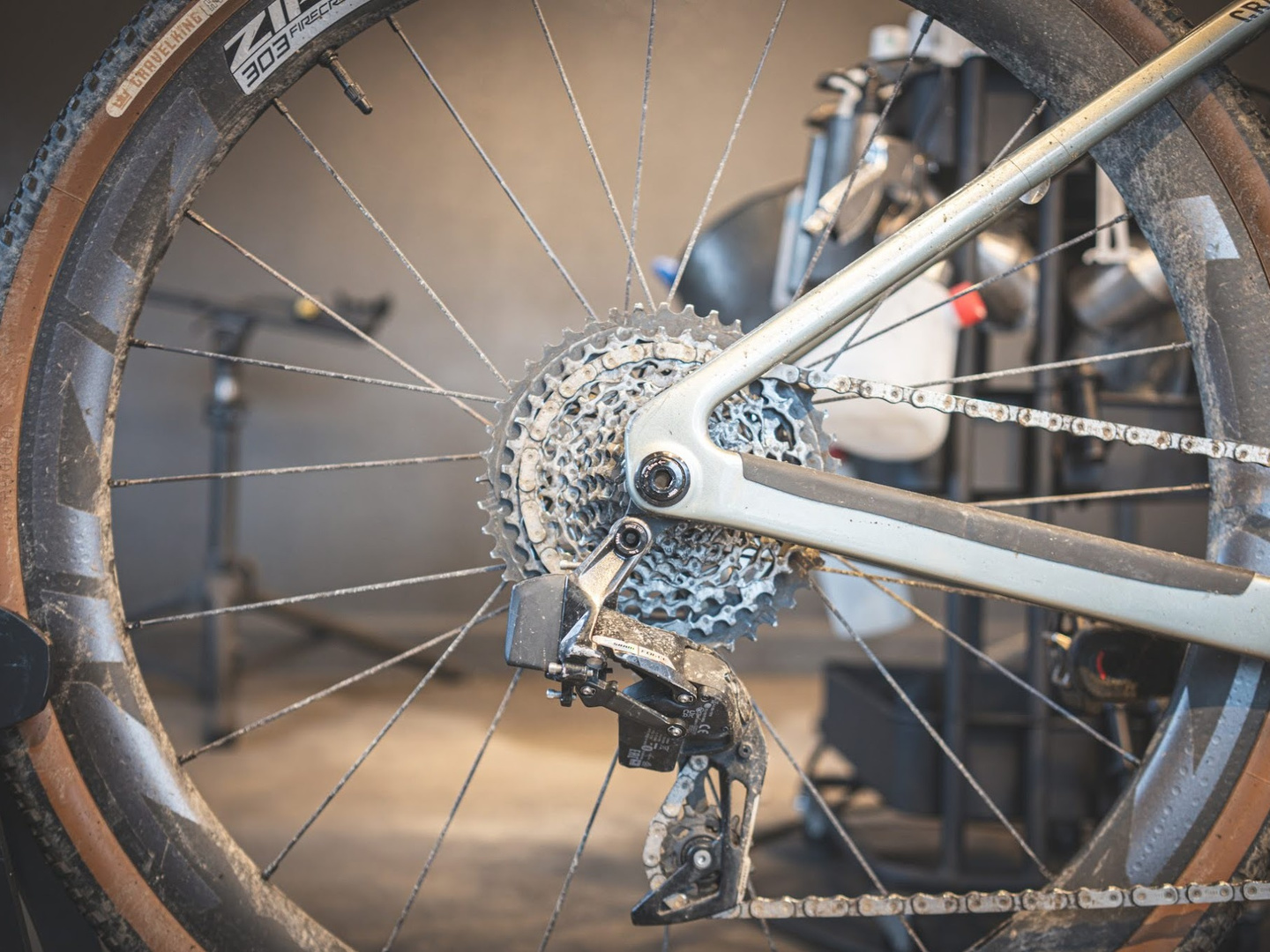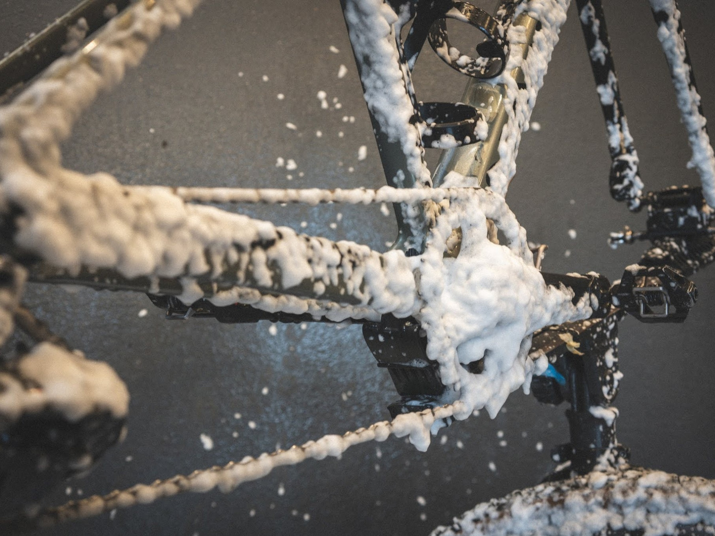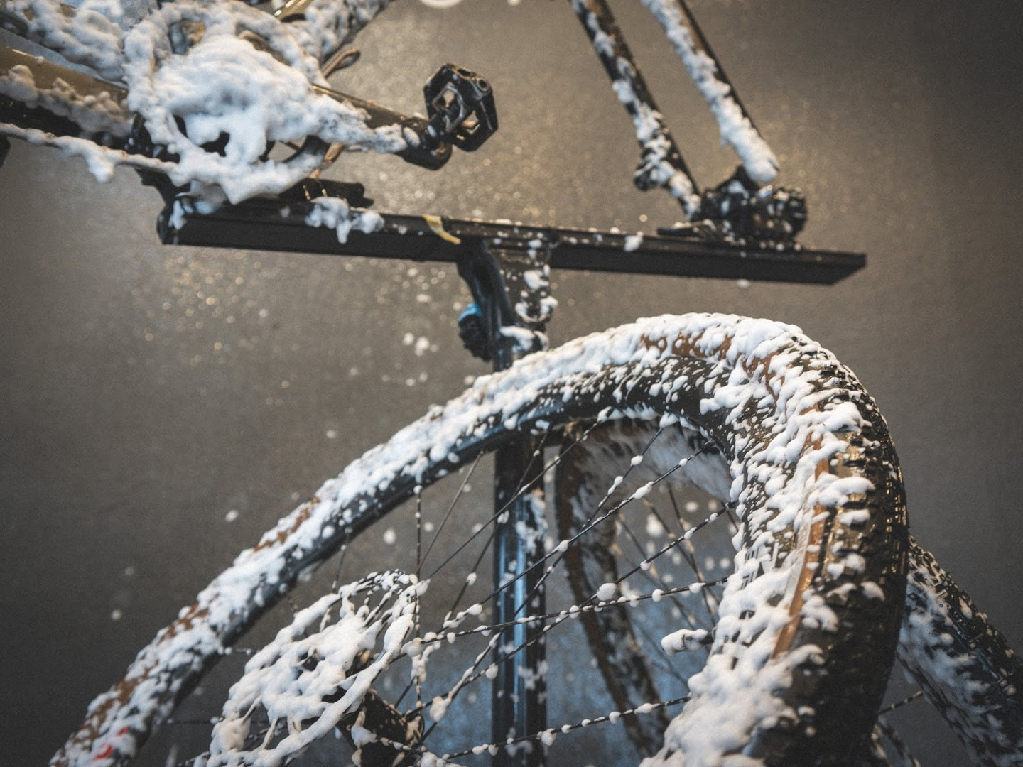 そこで専用ブラシでサイドウォールからトレッド面まで丁寧にブラッシング。泥が繊維や溝に入り込む前に落とすことで、質感と色味がよみがえります。特にグラベル用タイヤは溝が深く、泥をため込みやすいだけに、洗い上がった直後の爽快感は格別です。