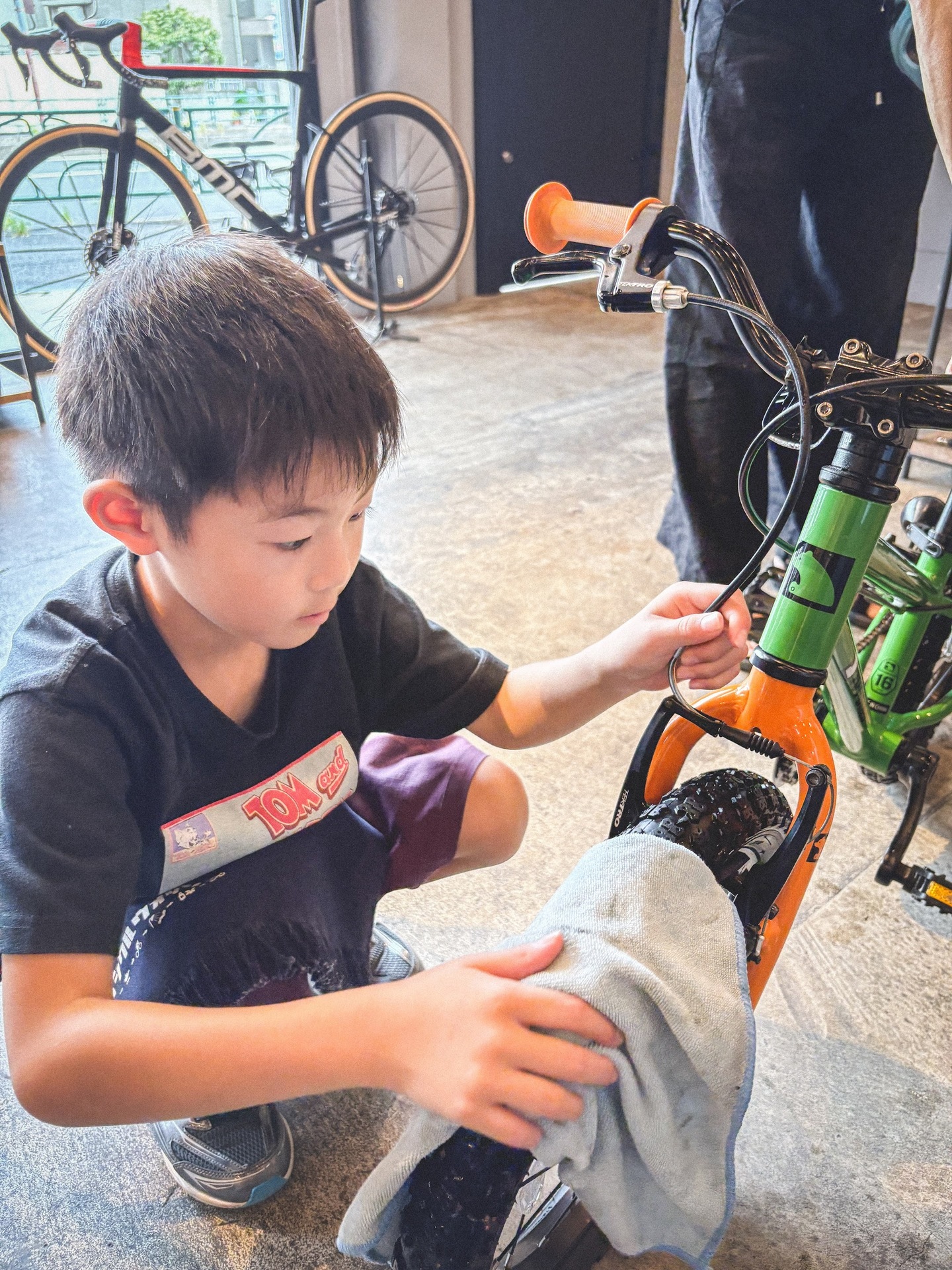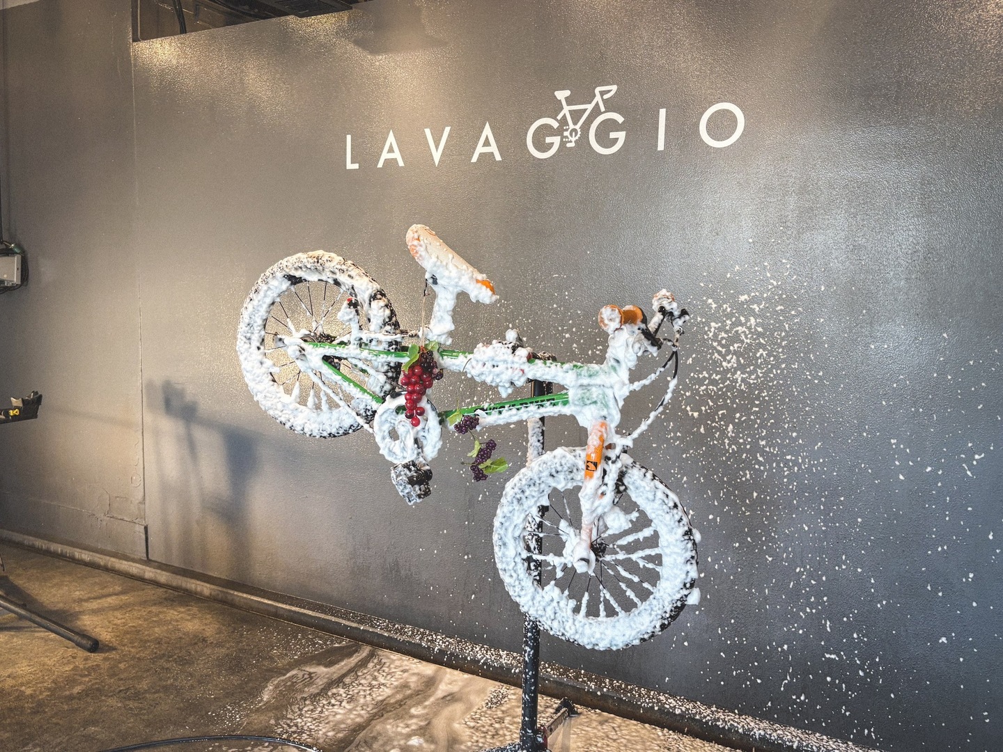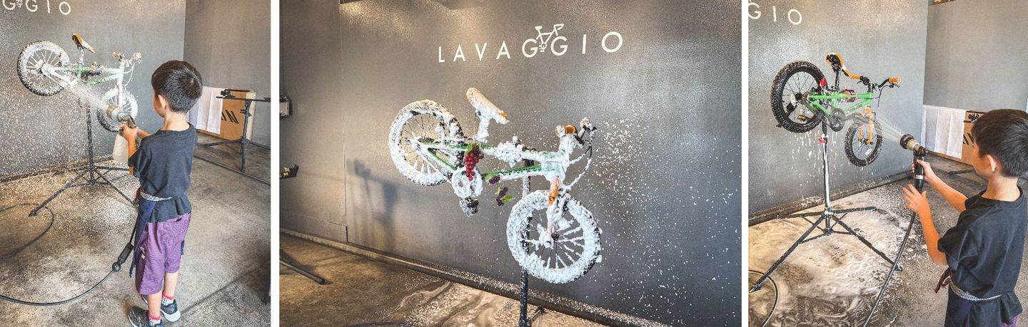 そうしてお店に入ってくれたお子さんは、以前体験した泡々洗車をしっかり覚えていて、最初からやる気満々。泡フォームガンの手つきも板につき、チェーンやフレームについたホコリを自分からどんどん落としていく姿は、もう立派な“小さなラバッジョスタッフ”でした。拭き上げまでしっかりと仕上げてくれて、最後には自転車が見違えるほどピカピカに。