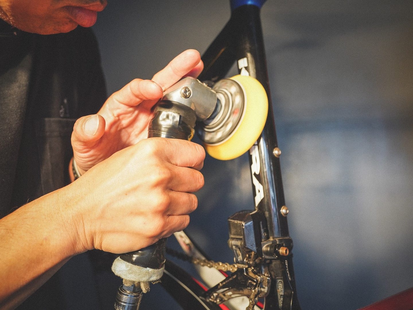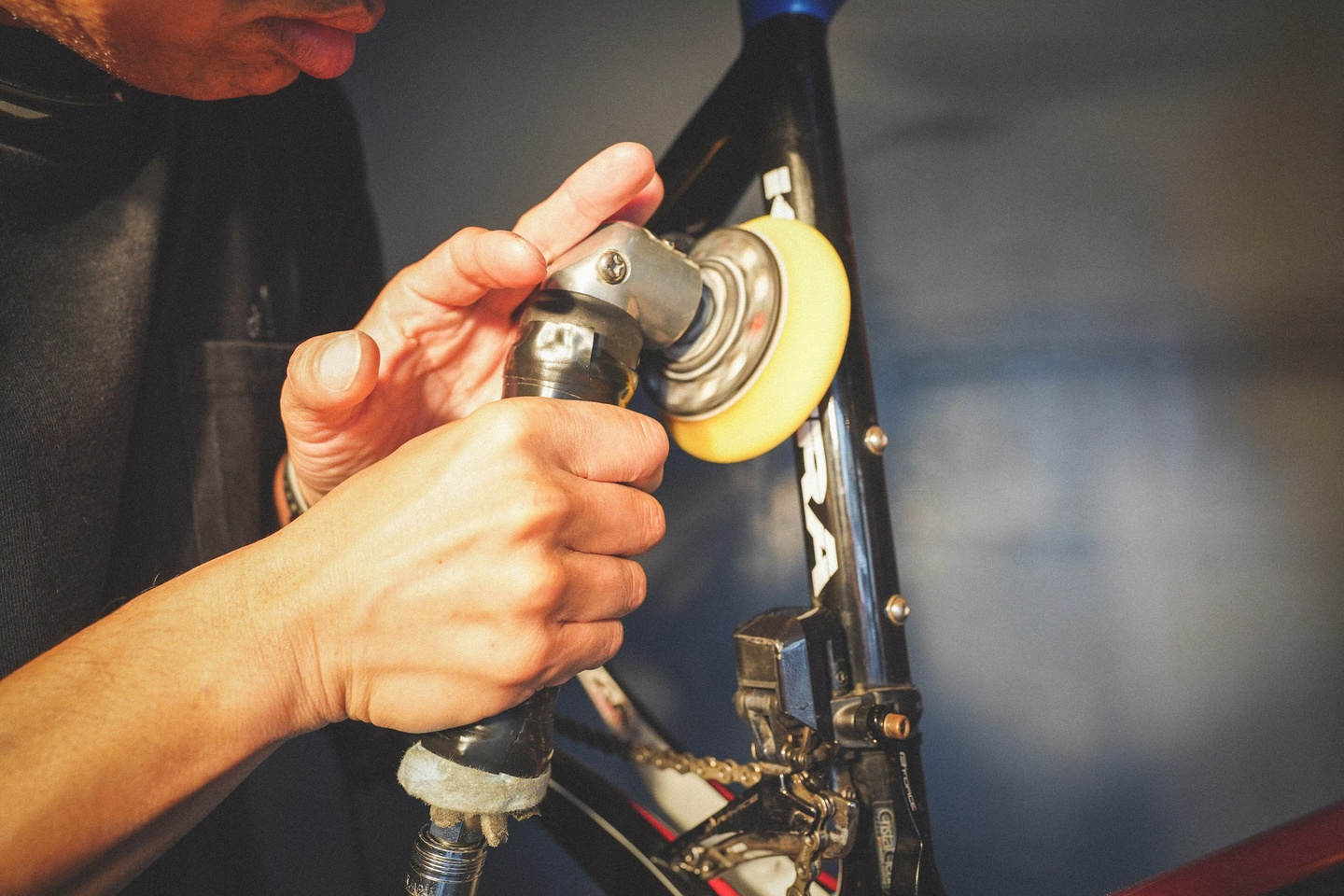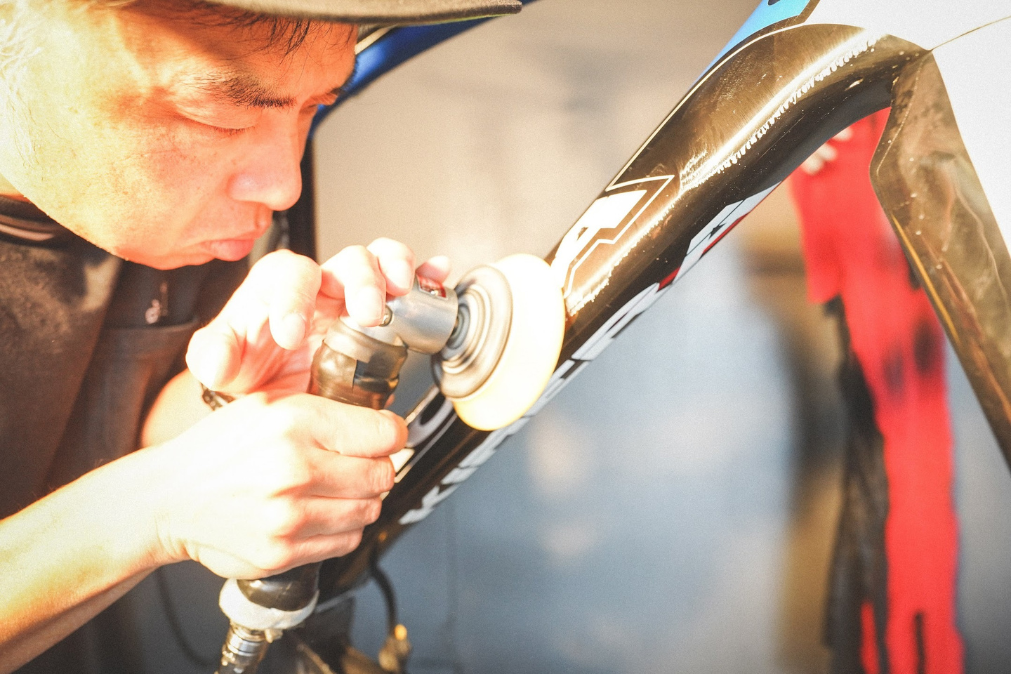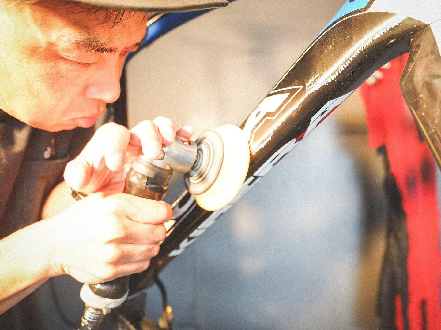 どこに時間をかけるのかを見極めるのがとても難しい。今回は傷の多さから、最も目立つフレーム部分の研磨に時間をかけて作業プログラムを組みました。
