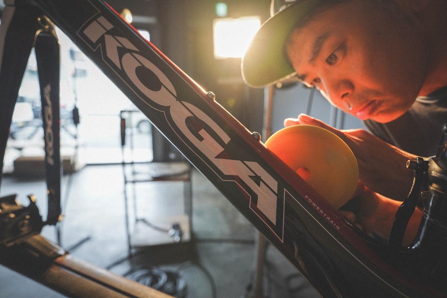 研磨を進めるうちに、少しずつKIMERA本来の鮮やかな色が蘇り、当時の輝きを取り戻していく様子にこちらも思わず見惚れてしまいました。ホイールはマット仕上げで、やや汚れが目立っていましたが、専用の染み抜きとマット対応コーティングでしっかりと整え、落ち着いた美しい質感に。