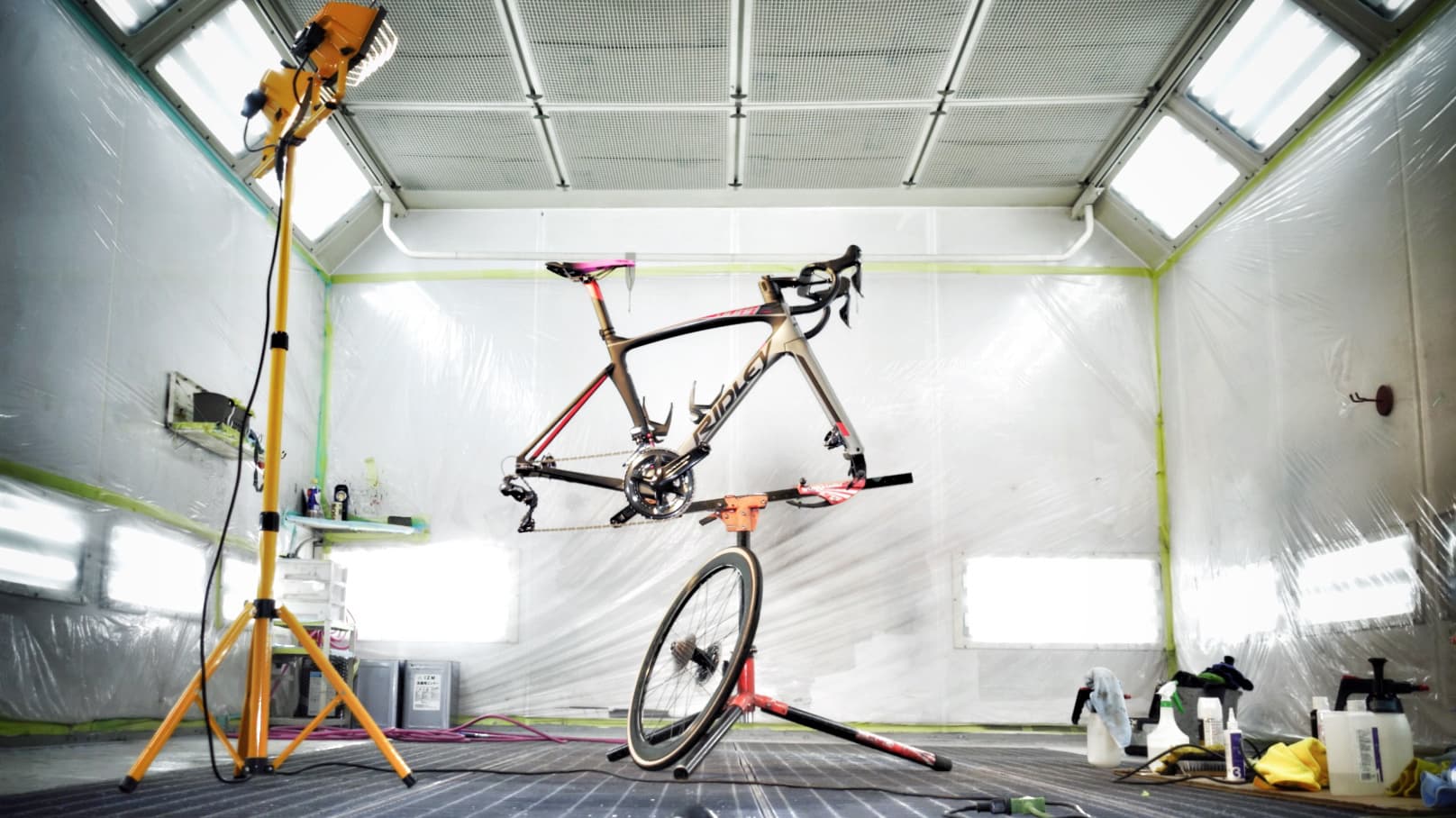 自転車業界では初となる焼き付けコーティング施工です。クルマ業界ではフェラーリやポルシェなど超高級車に施工されるこの技術。専用の焼き付け機器を使用し、徹底した温度管理のもと焼き付け専用のコート剤を塗装としっかり結合させます。またバフ磨きの時間も2スターコーティングより長くなることでより深い艶感を表現できます。