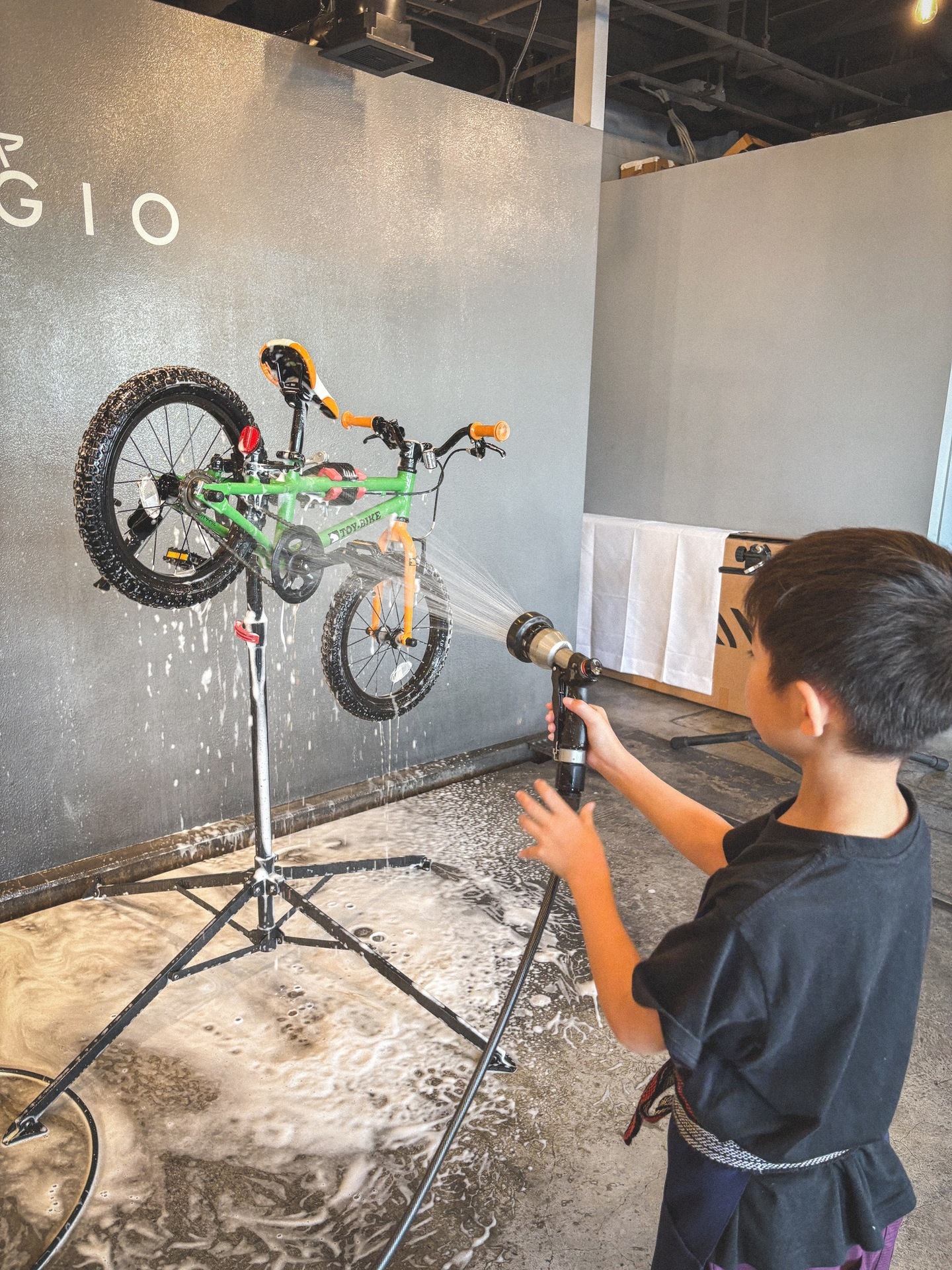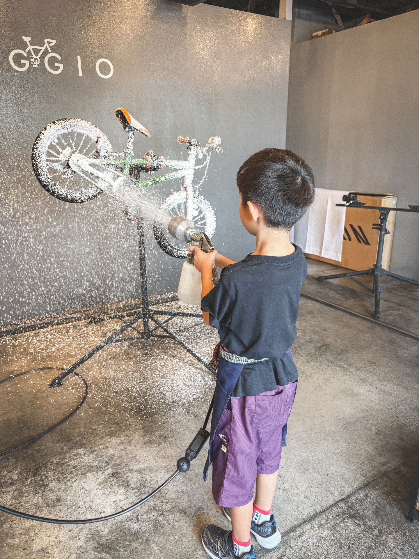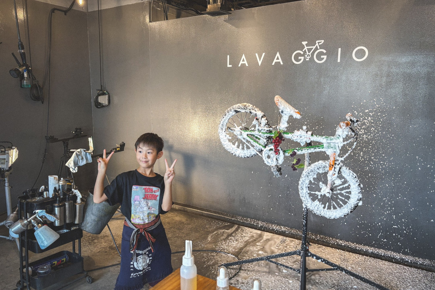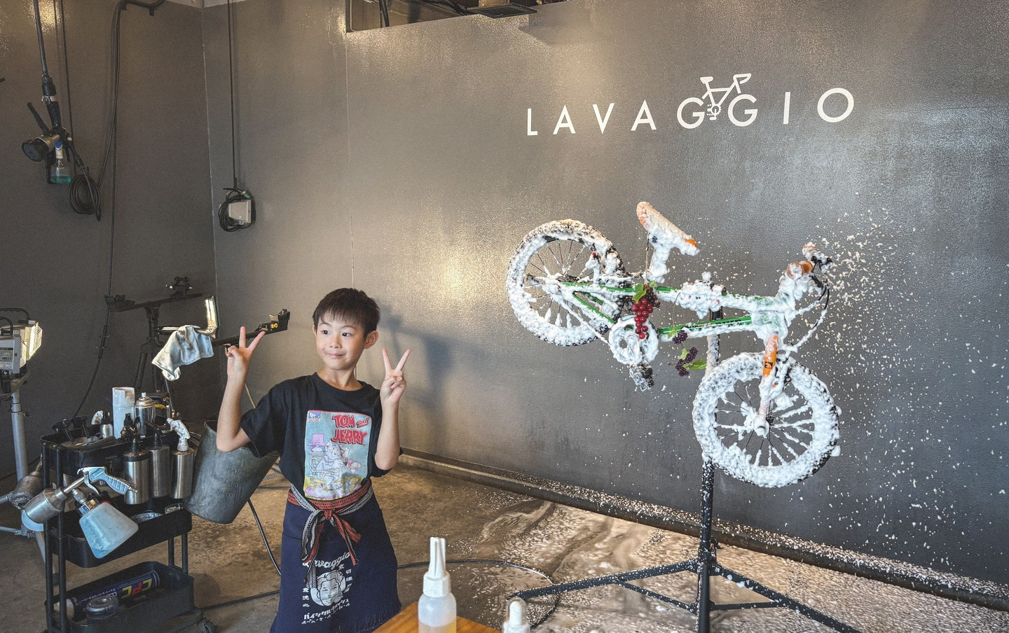 そうしてお店に入ってくれたお子さんは、以前体験した泡々洗車をしっかり覚えていて、最初からやる気満々。泡フォームガンの手つきも板につき、チェーンやフレームについたホコリを自分からどんどん落としていく姿は、もう立派な“小さなラバッジョスタッフ”でした。拭き上げまでしっかりと仕上げてくれて、最後には自転車が見違えるほどピカピカに。